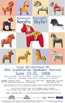 In Fargo & Moorhead, ND/MN. Explore the unique cultures of Denmark, Finland, Iceland, Norway, Sweden and Saami Land. Experience the finest in Nordic Hospitality, Food, Entertainment and Family Fun. Discover Scandinavian Arts, Traditions and Contemporary Cultures and more! Next year Scandinavian Hjemkomst Festival in Fargo/Moorhead: June 22-24 in 2007 |
