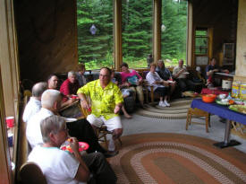 2 May 2006 Members of the Syttende Mai planning committee met with Jim Kurtti from the Finnish American Heritage Center, Jane Nordberg of the Daily Mining Gazette newspaper and visiting author, Solveig Tolvik who was in town signing her new book "Nikolai Fortune". Her book is about 4 generations of women in her family who she thought were Norwegian because they had come to America to the Copper Country from Artic Norway. But it turned out they had been like many who came to work in our Copper Mines from that area; they had come from northern Finland and migrated to Artic Norway/Lapland because there were jobs in the mines or fishing industry there and fish a plenty to eat during a time of repeated crop failures in the Scandinavian countries. But the Artic Norway mines were closing in the 1860s so these people then migrated to the Copper Country here in Michigan to work in the mines. Jim told us about the first Scandinavian churches that were built here. The first, established in 1868, was called Holy Trinity and was located near Calumet in an area now known as Frenchtown and served Norwegian, Swedish and Finnish people. There was a second Scandinavian church located in Calumet also. As finances allowed and disagreements forced, these divided into their own respective congregations. Jim told us of some impressive alter paintings done by the same painter for each of these churches. One of those alter paintings from the Calumet Scandinavian church is now located in the archives of the Finnish American Heritage Center. The other alter painting that went from the Frenchtown Scandinavian church to the Norwegian Lutheran church that was located at the top of White Street in Hancock is now displayed in an office in the Gloria Dei Church in Hancock. The Frenchtown and White Street churches are now just rock foundations among the weeds.